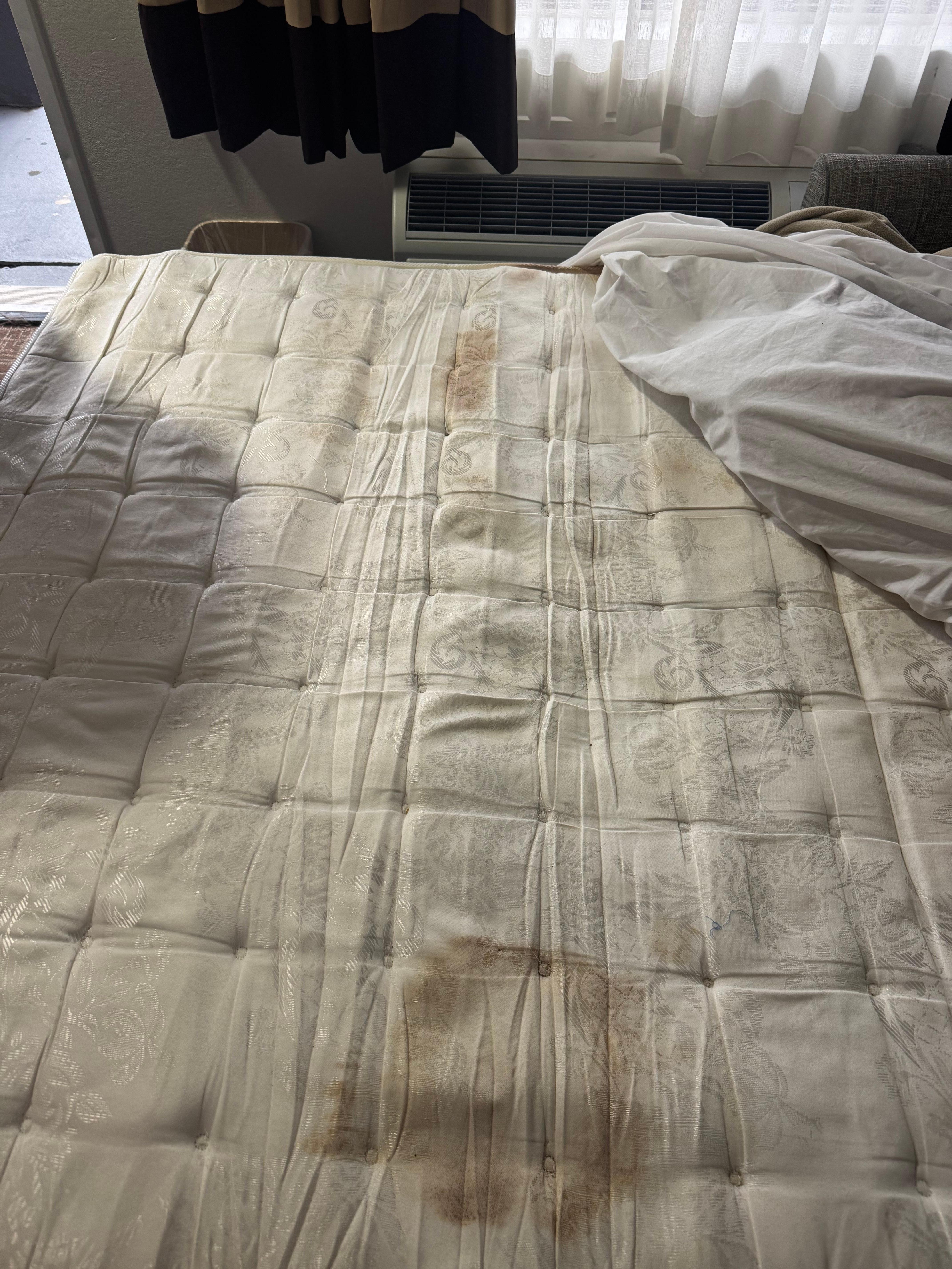 Was the last minute stay because the weather was bad. The room was horrible. The curtains were besides old they were very dusty like on top of them the carpet was filthy the couch was ripped it looked like an abandoned hotel room. The only good thing I can say is it seemed that the bathroom was clean enough but I did not wanttake a shower... I checked the beds bed bugs thankfully I did not see any so the bed was comfortable The mattress was disgusting and I know because I pulled the sheets back to check the bed stained gross but at least the sheets were clean.