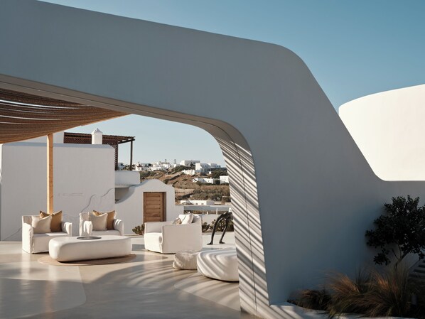 This was a beautiful resort up the hill from the main town. The pool and hot tub in room were great, breakfast buffet was delicious, and the staff was amazing. This is the perfect option if you want somewhere to stay a little outside of the loud and busy town. We wanted more relaxation and it was perfect. Its an easy 18 min walk down to the town and you can catch a shuttle or ride back up if you dont want to walk uphill. For a young couple - the walk was fine both ways. Highly recommend for your stay in Mykonos.