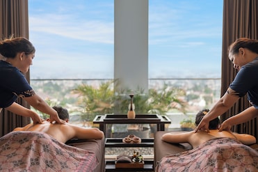 The hotel offers a daily spa with aromatherapy, body scrubs, and massage treatments. Couples rooms provide intimate relaxation. A fitness room awaits.