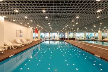 Luxury awaits at this hotel with an indoor pool, seasonal outdoor pool, and a children's pool. The area features a hot tub, loungers, and a poolside bar.