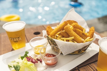 The seasonal outdoor pool invites blissful relaxation with comfortable loungers and shady umbrellas. Little ones splash happily in their own children's pool.