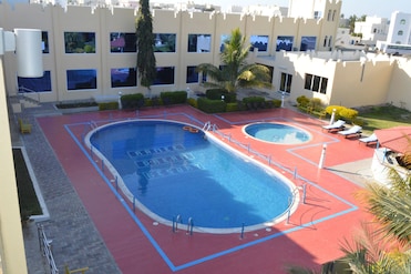 季节性室外游泳池为成人提供奢华的休闲场所,而孩子们则可以在儿童游泳池中嬉戏。泳池遮阳伞提供凉爽的凯富。