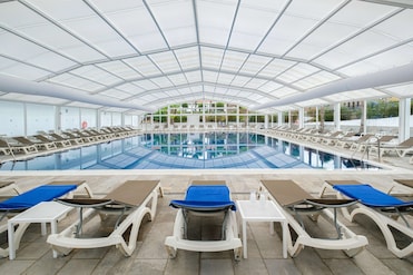 This hotel features 2 outdoor pools and a free water park with a waterslide. The pool area includes loungers, umbrellas, and a poolside bar.