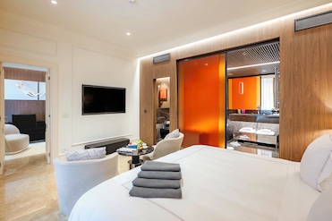 客人身着浴袍,在防过敏的高档床上用品上进入梦乡。24 小时客房服务和迷你吧让您尽享奢华。