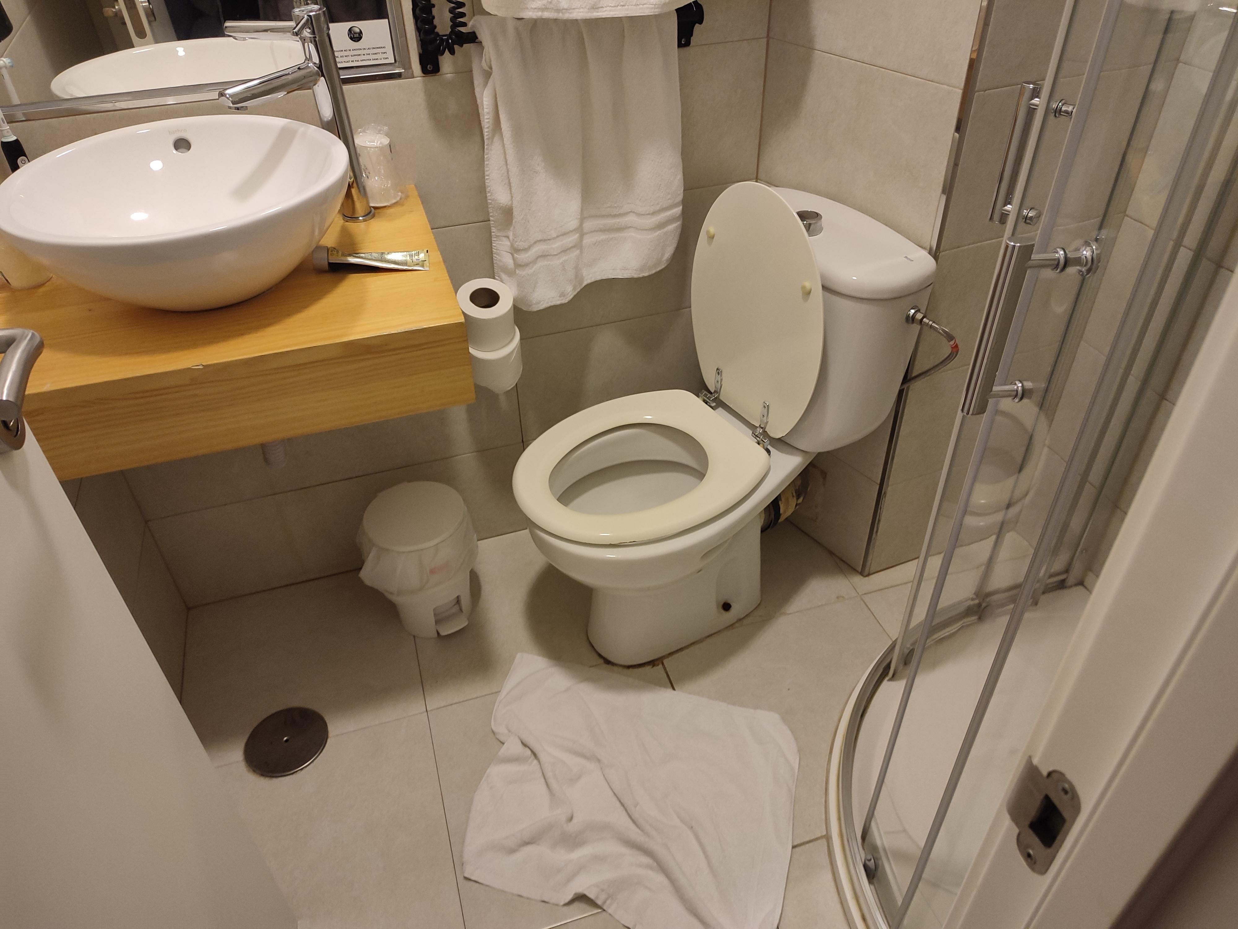 J'ai choisi cet hôtel pour son emplacement, impeccable.... Par contre, nous avions au 102 une salle de bain entière dans un emplacement de placard. Il mérite son unique étoile mais le prix en octobre de 65€ est d'un 3 ou 4 étoiles en Espagne. Le wc est mis en travers sous l'évier... Un homme doit être un tireur d'élite pour uriner debout en travers. Le summum, faisant 1m93, est que je suis dans l'impossibilité de m'asseoir, les genoux bloquent sous l'évier...le matin, j'ai du aller au bar en bas de la rue pour aller aux toilettes a 7h30 .... Je le signale a l'accueil, elle est embêtée mais aucune explication ou excuse. Et je ne parle pas que la chambre n'a qu'une prise de courant disponible pour deux téléphones minimum à recharger... pas de table de chevet pour moi, lunettes sur le sol côté fenêtre, lampe centrale avec un interrupteur a l'entrée, obligation de se lever pour éteindre ou allumer.... pour le placard bain , l'interrupteur vest positionné dans la chambre , désagréable d'ouvrir la porte avec lumière en pleine nuit....Une honte à 65€ !!!!