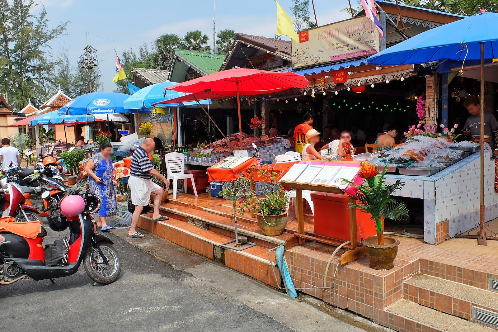 Bounty Seafood Restaurant is part of a line of small seafood restaurants at the southern end of Karon’s beachfront road. All pretty much follows the same style: seafood out on display in beds of ice, a seafood-heavy menu with Thai and international dishes, pretty similar prices, and an open frontage with a view out to the sea.