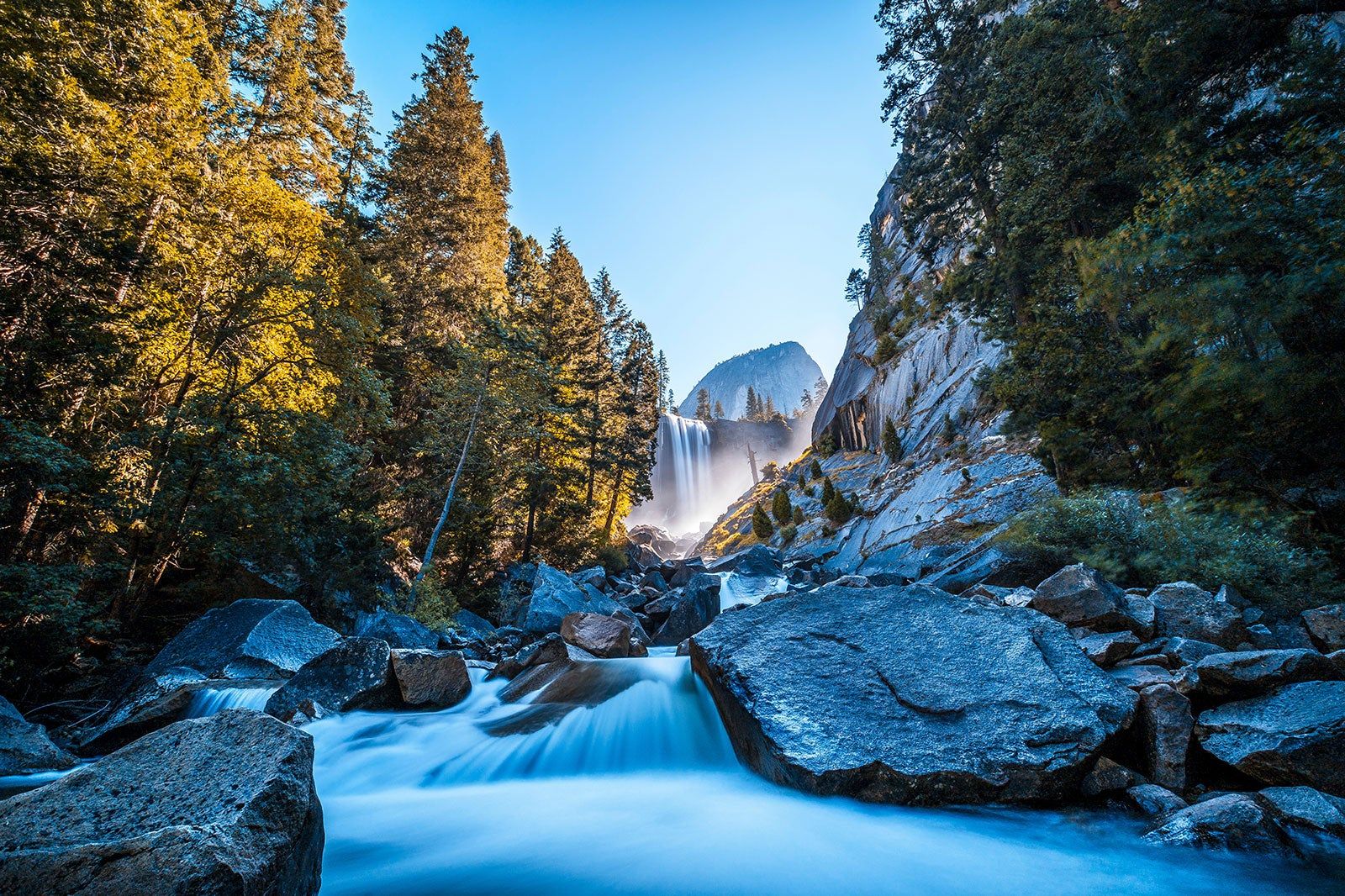 Found along the famous Mist Trail, the turbulent Nevada Autumn tumbles 594 feet onto a cluster of rocky boulders, creating a huge spray and foaming white water. The Mist Trail first takes you past Vernal Autumn, and from there getting rockier and more challenging before finally arriving at Nevada Autumn.